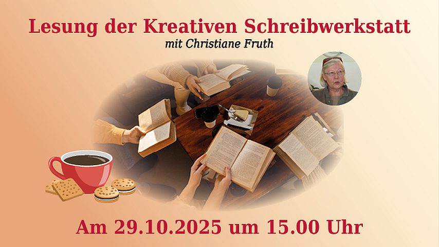 Die Teilnehmer*innen unserer Schreibwerkstatt, unter der Leitung von Christiane Fruth, präsentieren stolz ihre entstandenen Werke – von berührenden Geschichten bis hin zu humorvollen Texten. Dazu reichen wir kleine Köstlichkeiten aus unserem Café – der perfekte Rahmen für nette Gespräche in entspannter Atmosphäre. Teilnahmegebühr 10,00 Euro incl. Snackbuffet (Getränke extra) Anmeldung erforderlich bis 27.10.2025 unter 030...