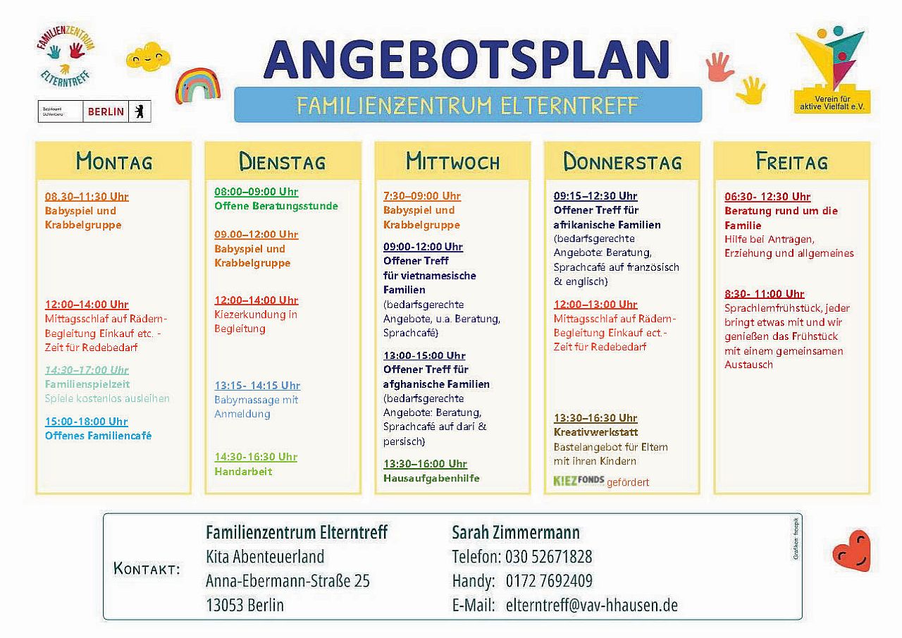 Der Elterntreff hat sich im Januar 2016 neu aufgestellt. Ob kreativ, sportlich oder kulinarisch, zum Kniffeln oder Basteln, Erkunden und Krabbeln – in den Angeboten des Treffpunktes ist seither für allen etwas dabei. Unsere Veranstaltungen finden in den Räumlichkeiten der Kita Abenteuerland statt und richten sich vorrangig an die Familien, deren Kinder die Kita besuchen. Mütter und Väter finden hier Momente zum Austauschen, zum einmal Durchatmen und einen geschützten Rahmen zum Ausprobieren. Sie erleben Unterstützung und erfahren eine Gemeinschaft mit anderen Familien.