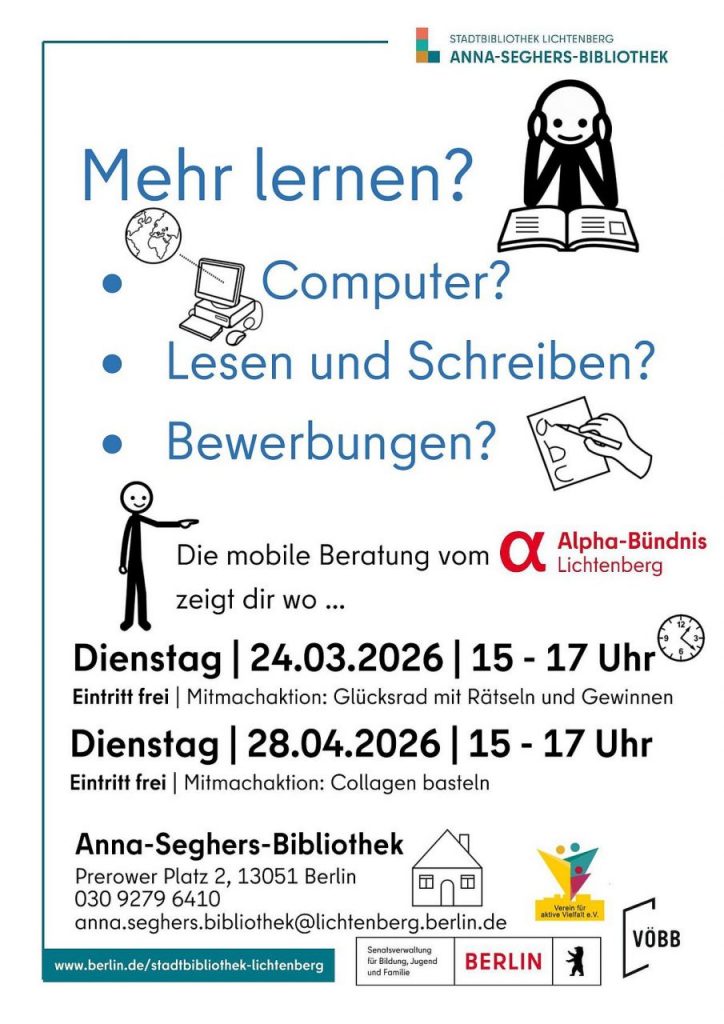 - 1 x monatlich: Anne-Seghers-Bibliothek: dienstags, 15-17 Uhr: Beginn März (24.03., 28.04., 26.05.) im Lindencenter, Prerower Platz 2, 13051 Berlin