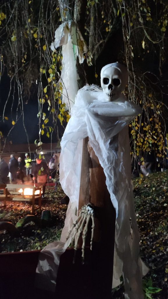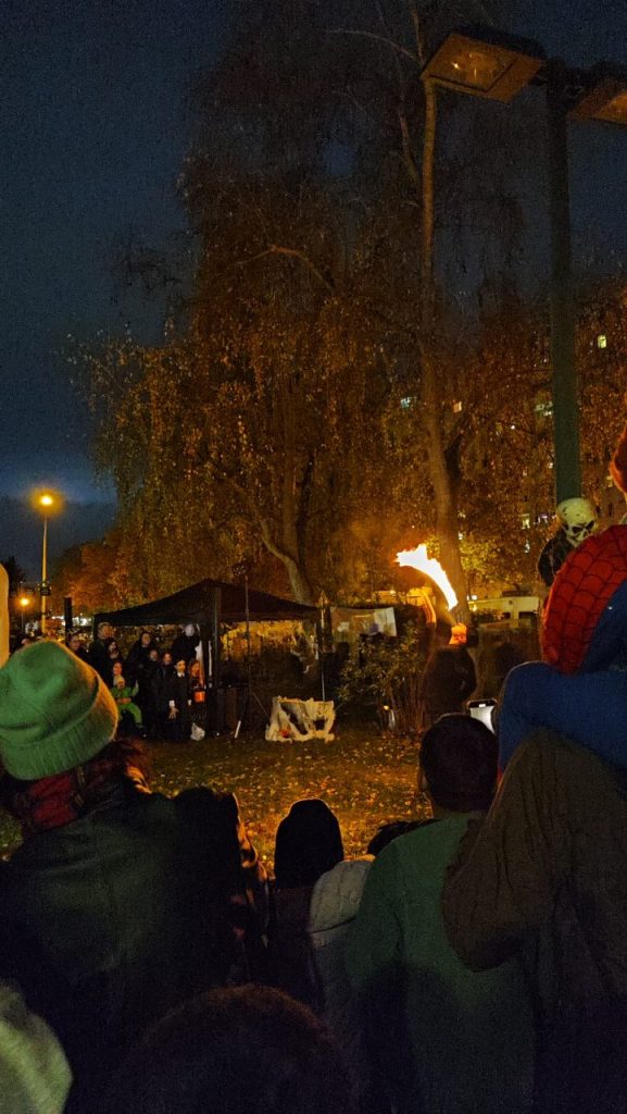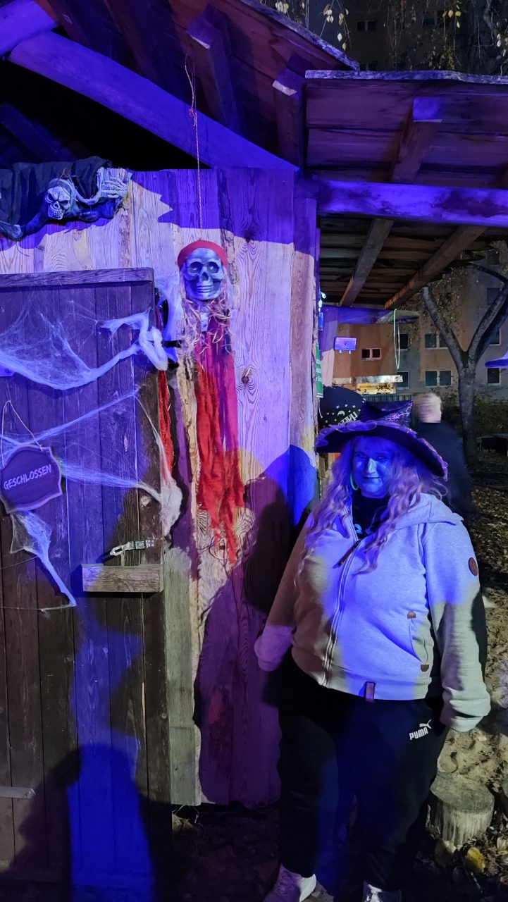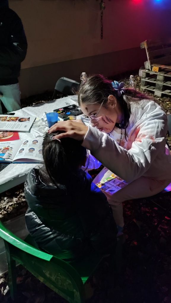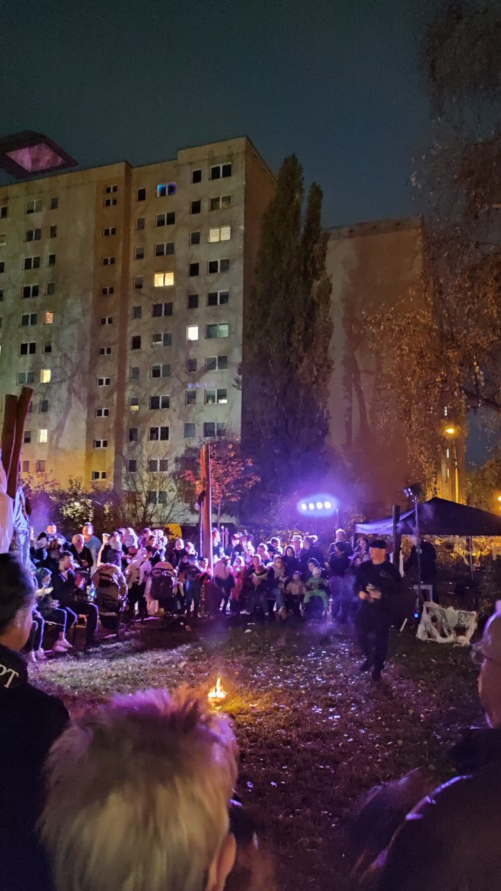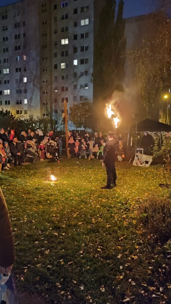 Am 31.10.2025 wurde es im Garten des Nachbarschaftshauses wieder schön gruselig! Vom Familienzentrum Grashalm organisiert wurde ein vielseitiges Angebot. Es gab ein Gruselhaus, ein Hexenhaus, Kinderschminken, eine Bastelstation und eine Fühlkiste. Für die besonders schaurige Atmosphäre hat die Kinder-Gruselmusik und Moderation durch Hardy Wagner gesorgt. Feuerschalen mit Stockbrot, Dekoration und Lichter haben das Ganze abgerundet. Ein Highlight war die Feuershow „Stone & Fire“.