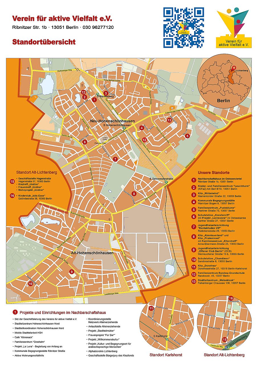 Der Verein für aktive Vielfalt e.V. ist seit seiner Gründung im März 1991 – damals noch unter dem Namen Verein für ambulante Versorgung Hohenschönhausen e.V. – in Lichtenberg-Hohenschönhausen ansässig. Er ist in seiner Arbeit konfessionell und parteipolitisch neutral und interkulturell. Der Verein ist anerkannter Träger der Kinder- und Jugendhilfe. Er arbeitet aktiv in den verschiedenen Fachgremien und Netzwerken des Bezirkes und in Fachgruppen auf Landesebene mit. Er ist Mitglied im DPW und im Verband für sozial-kulturelle Arbeit und Mitbegründer des Bundesverbandes der Familienzentren.